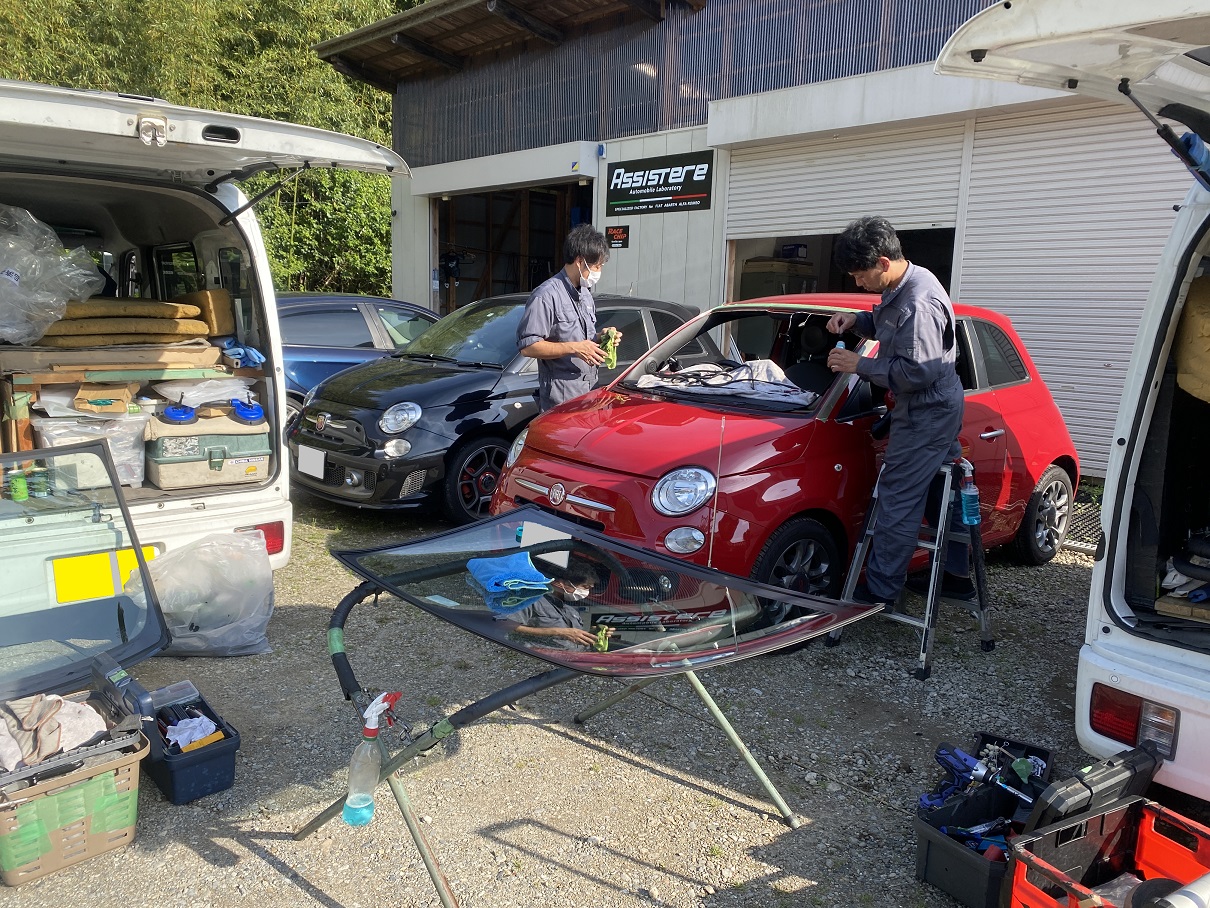 フロントガラスに飛び石が当たっての交換作業です。