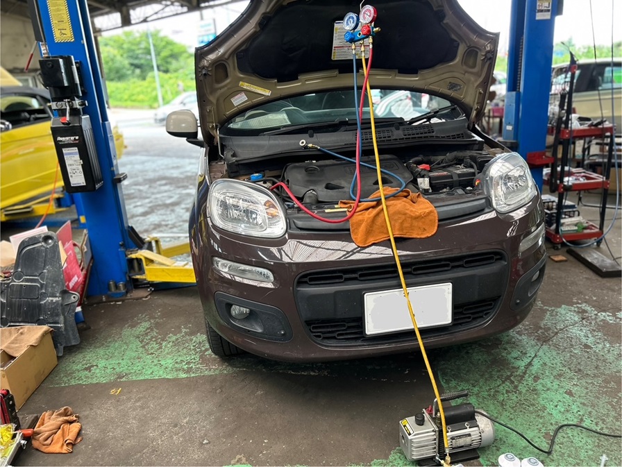 FIATパンダ エアコンのガス漏れにより冷媒補充です
